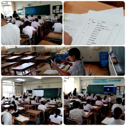 文化発表会の取組み、舞台発表の台本を読み通し、役者や裏方等の役割の希望をアンケートしています。普段でしたら集会の形で説明し、教室に戻ってアンケートをとる流れですが、生徒たちは教室から出ることなく、説明する先生がオンラインで各クラスをつなぎ、説明をしています。