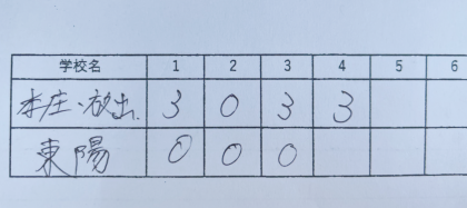 昨日に続き、府総体予選に出場、準決勝で東陽中と対戦、9-0で勝ちました。この後、市岡中、三国中チームと決勝戦です。