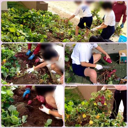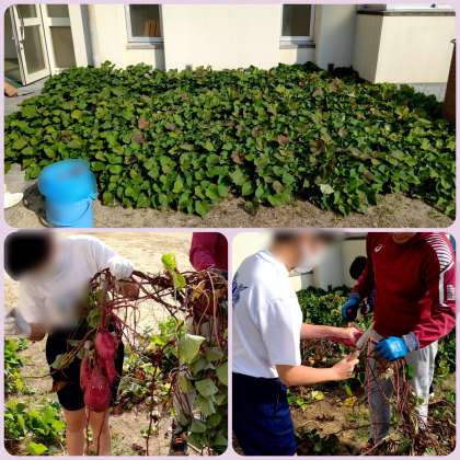 春に苗を植えたさつまいも、ぐんぐんと葉を伸ばし、いよいよ収穫の時期となりました。特別支援学級では本日、芋掘りをしています。ご覧のように今年はこれまで以上に沢山の、しかも大きなサツマイモが取れました。