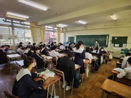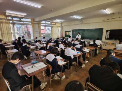 3つの異なるレール上で小球を走らせたときに最も早くゴールするものを運動エネルギーなど学習した事柄を使って、それぞれ班で話し合いながら求めています。