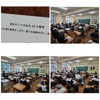 期末テストを終え、テストの反省をしたり、今後の進路選択をふまえ、プリントにて自分はどんな人物なのか、どんなことに興味を持っているのかなど、様々な質問に答えながら客観的に自分達を見つめる活動をしています。