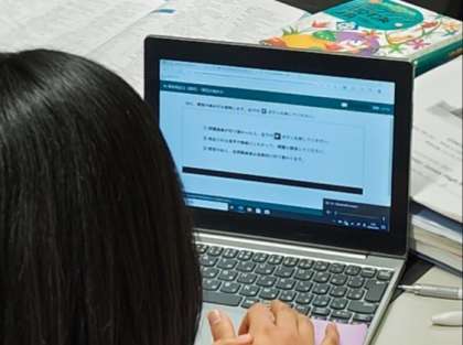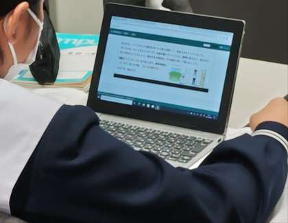 来年度の全国学力学習状況調査において、英語の「話すこと」調査が入ってきます。その事前検証として、2年生では個々のタブレットを使ってテストができるか、事前に模擬問題に取り組んでいます。
