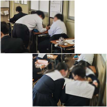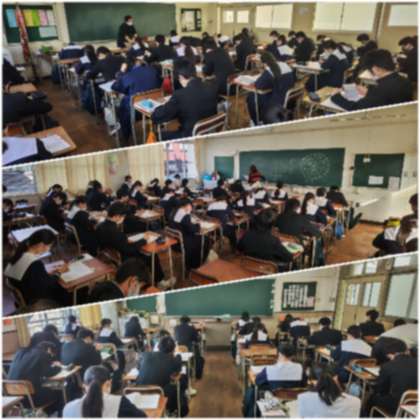いよいよ私立高校の入試本番を10日(金)に控え、3年生ではどのクラスでも問題集やワークを使ったり、プリントを使って直前の復習で一問一答をしたり、追い込みに余念がありません。