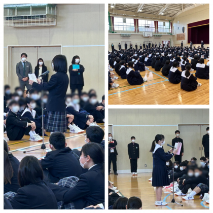 対面式 公開日 2023/04/10 更新日 2023/04/10 校内の様子 対面式の様子です。在校生代表の生徒副会長より「歓迎のあいさつ」、新入生代表生徒より「新入生のあいさつ」がありました。 いいね(0)