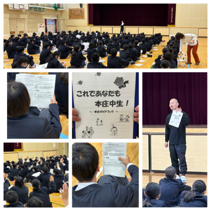 全校集会や学年集会、朝読書など、本庄中学校でのルールを学年全体で共有しました。