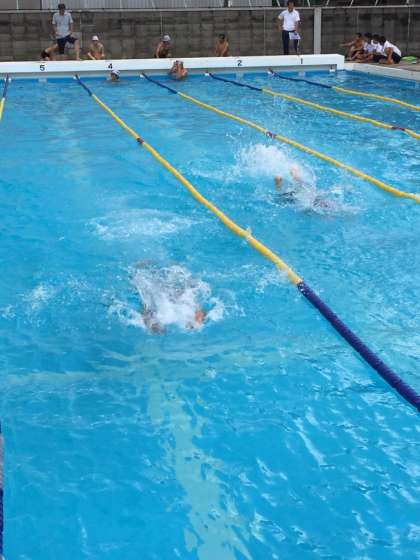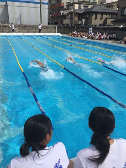 9月1日火曜日の午後、雨で延期かとも心配されましたが、小雨にかわりなんとか水泳大会が行うことができました。最後の水泳大会ということでおおいに盛り上がり、応援の喚声は校舎まで届いたほどでした。得意な水泳で力いっぱいクラスのためにがんばった人、リレーの補欠で何回もがんばってくれた人、苦手な種目でも最後までがんばってくれた人、みんながそれぞれに最後の水泳大会をやりきってくれました。