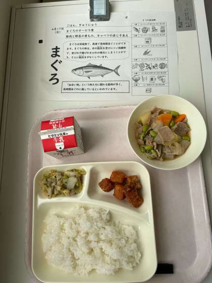 本日の給食 ・ごはん ・牛乳 ・まぐろのオーロラ煮 ・豚肉と野菜の煮物 ・キャベツの赤じそあえ