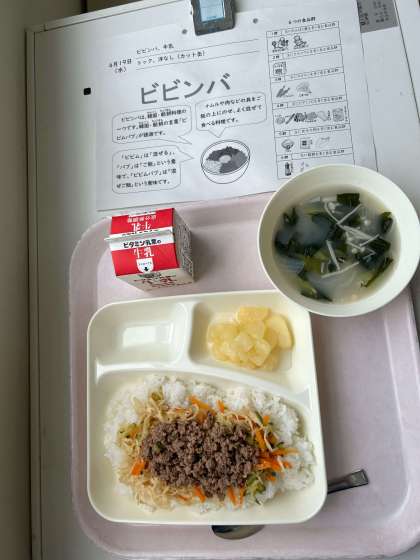 本日の給食 ・ビビンバ ・牛乳 ・トック ・洋なし