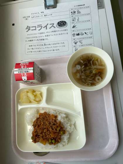 本日の給食 ・タコライス ・牛乳 ・もずくのスープ ・焼きじゃが