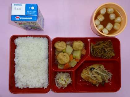 今日の給食では、から揚げにしたマグロに、きのこの入ったあんをかけています。