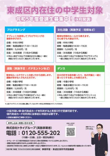 東成区では、9月より中道小学校、中本小学校の施設を利用し、児童生徒の「心の居場所づくり」を目的とした放課後の運動・文化活動を実施します。