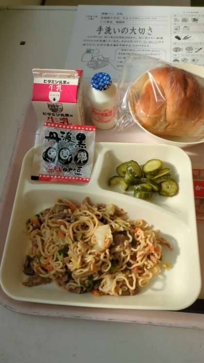本日の給食 ・黒糖パン ・牛乳 ・和風焼きそば ・きゅうりのしょうがづけ ・いり黒豆 ・発酵乳