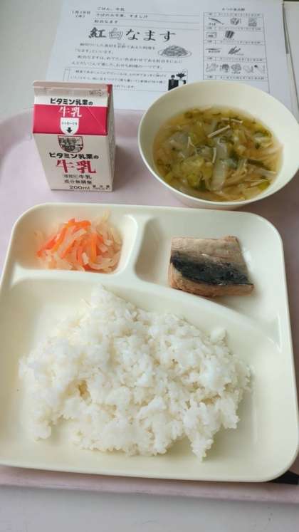 本日の給食 ・さばのみそ煮 ・すまし汁 ・紅白なます ・ごはん ・牛乳