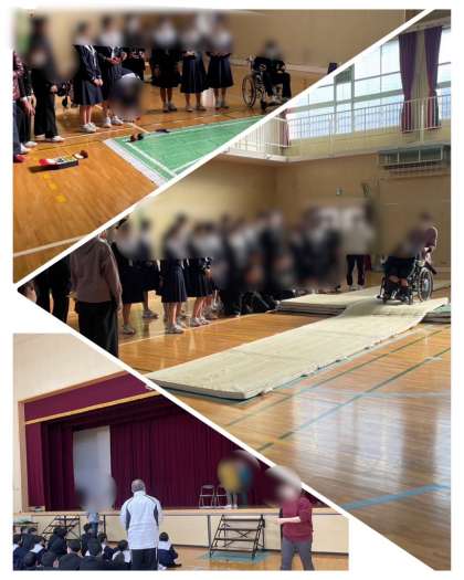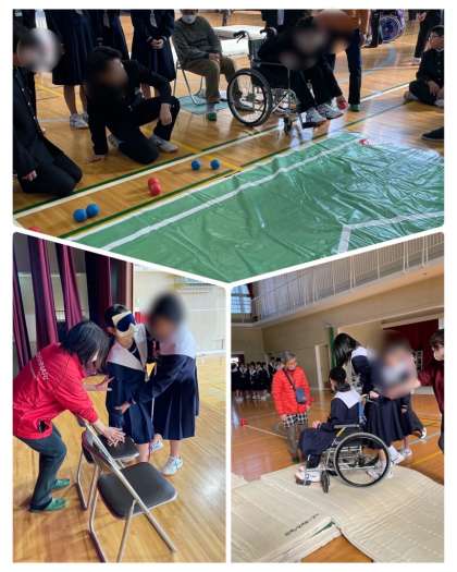 講話を聞き、車椅子介助体験、アイマスク手引き体験、ボッチャ体験をしました。