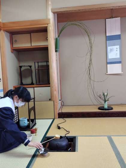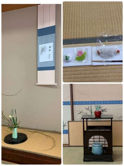 お菓子は蛍池の照月堂さんの花びら餅と四天王寺 河藤さんの梅に鶯、今年阿倍野の柏屋さんの干支の龍の焼き印の御干菓子です。お茶は豊昔という濃茶をおうすにして頂いています。