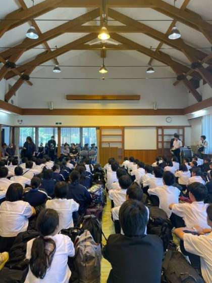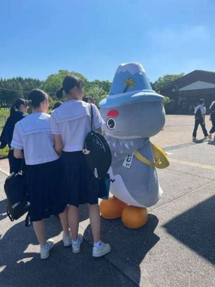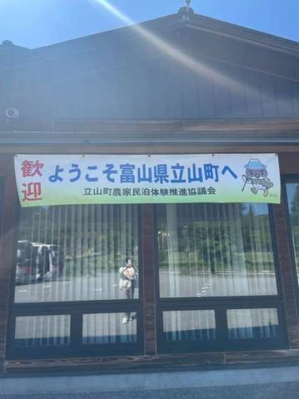 立山町のマスコットキャラクター「らいじぃ」が出迎えてくれました。入村式をしています。