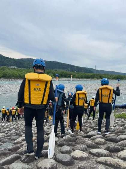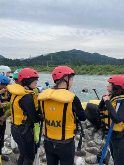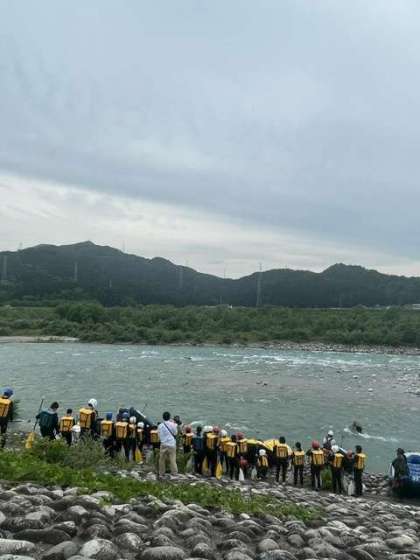 立山町での民泊体験を終え、黒部川に来ています。ウェットスーツに着替え、ラフティングに挑戦します。