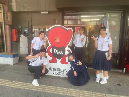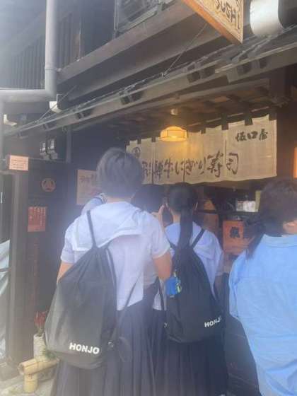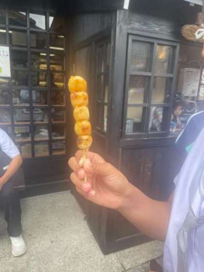 高山市内に到着し、班での散策がスタートしています。みたらしだんごや飛騨牛寿司などの食べ歩きも楽しんでいます。