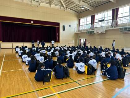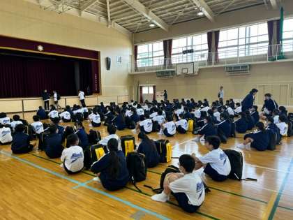 1年生は体育館に集合し、お弁当などの持ち物を確認しています。