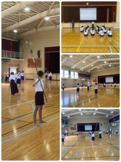 3年生女子体育の授業でも、薙刀を取り入れた授業を行っています。薙刀は、日本の伝統武道の一つで、体力や集中力を養うだけでなく、礼儀や作法を学ぶ貴重な機会となっています。生徒たちは、初めて触れる薙刀に興味津々で、真剣に取り組んでいます。