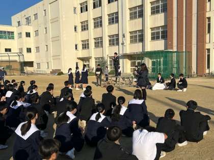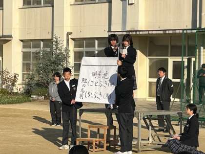 本日、全校集会が行われました。集会では、生徒会から学校内の池の名前が「明星池」に決定したこと、さらに池にいる鯉の名前も決まったとの報告がありました。