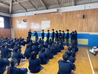 2年生の学年集会の様子です。 百人一首の個人表彰が行われました。