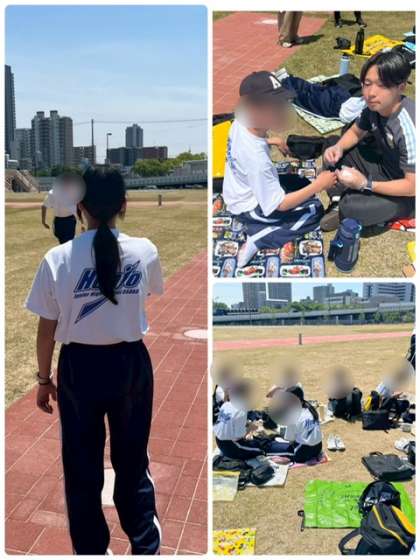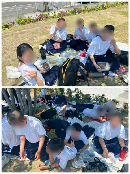 青空の下、友だちと笑顔でお弁当を広げる姿があちこちに見られ、心地よいひとときを楽しんでいます。
