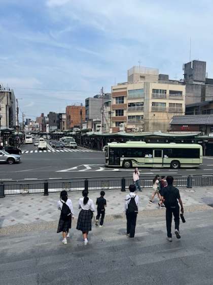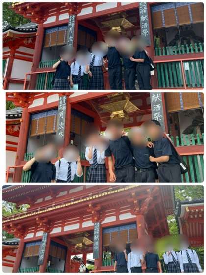 歴史ある八坂神社では、伝統や文化にふれながら、班ごとに協力して見学を進めていました。神社の静かな雰囲気の中、生徒たちは真剣なまなざしで案内板を読み、互いに話し合いながら学びを深めていました。