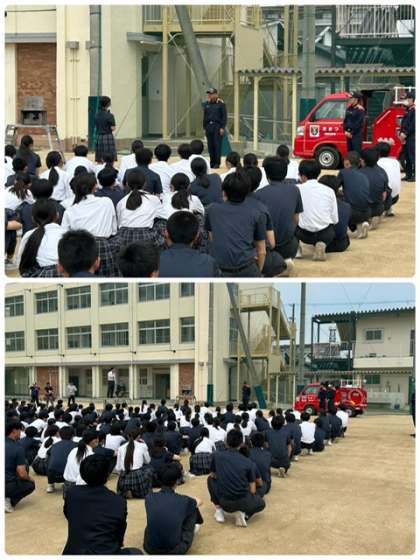 今回は、理科室から出火したという想定で行い、生徒たちは真剣な態度で訓練に取り組んでいました。