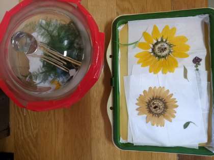 シリカゲルを入れて乾燥させたり、圧力をかけるなど、それぞれに合った方法で押し花を作っていきます。