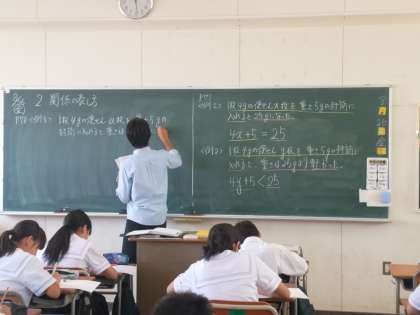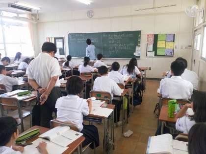 写真は1年生の数学の授業です。チームティーチングで、わからない問題や、質問にすぐ答えられるように、もう一人の数学教員が教室内をウロウロ・・・。