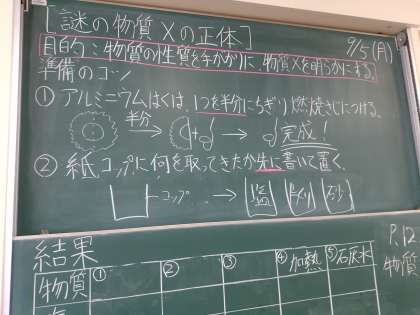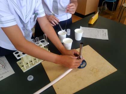 1年生はガスバーナーを使って物質を熱し、その蒸気の反応で物質を知りえる方法などを理科実験で学んでいます。