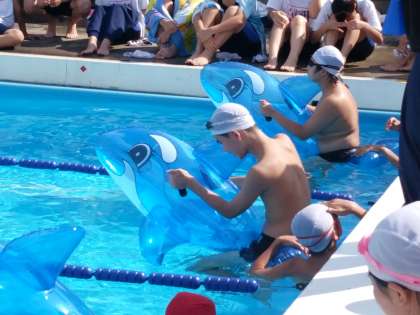 イルカリレー競技に参加する生徒です。乗ることが条件なんですが、なかなか乗れず。