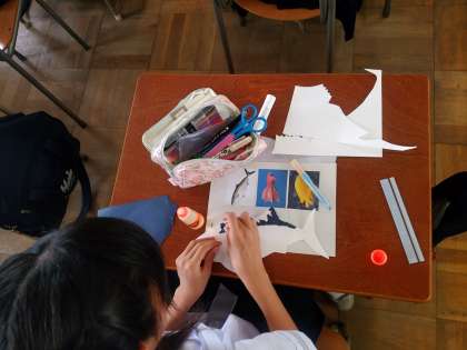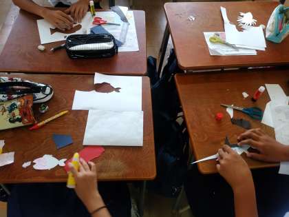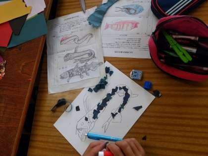 1年生は、舞台も展示も「海」をテーマにしています。今日から展示の準備に入りました。一人ひとりが思い思いの「魚」を和紙を使って製作しています。さて、これがどうなっていくのでしょうか。