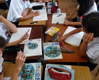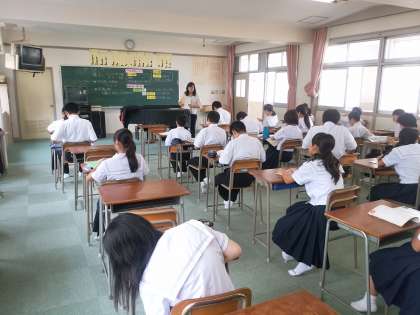 授業参観3時間目、3年生の社会や1年生の音楽の授業風景です。保護者の方々も熱心に聞き入っておられます。