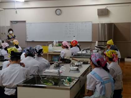 今日は1年生の家庭科では、調理実習をしています。まずは説明をしっかり聞いて、自分の役割を把握しています。