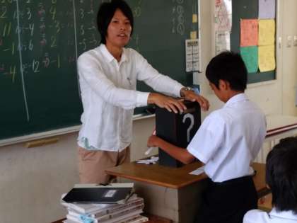 1年生の数学の授業で、関数を概念的に理解してもらう工夫をしています。箱の上部から入れたカードに書かれた数値。箱の後ろのタグを引くと、下部から数値が変わって出てきます。