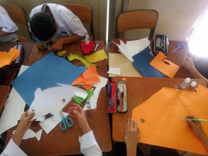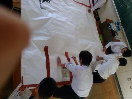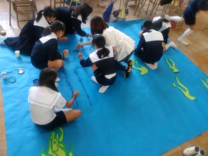 1年生の舞台背景を制作しています。大きなものですが、細かな間違いは許されません。何度も確認をしています。