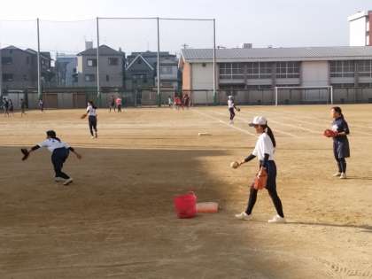 今朝のグラウンドの様子です。秋空の広がる中、ソフトボール部と、奥ではラグビー部がボールを蹴っています。