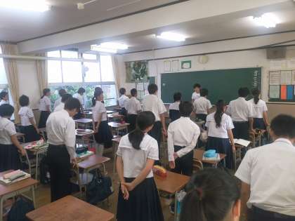 朝の学活でもまずは挨拶から。2年生は曜日毎に朝の学習の教科が決まっています。