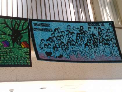 玄関では3年生の大きな切り絵が完成し、取り付け作業を進めています。