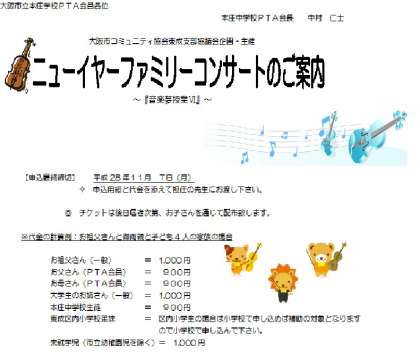 先日ご案内させて頂きました、ニューイヤーファミリーコンサートの締切が本日となっています。若干お席に余裕がありますので、申込期日を11月9日(水)午前中に延期させて頂きます。どしどしお申し込みください。
