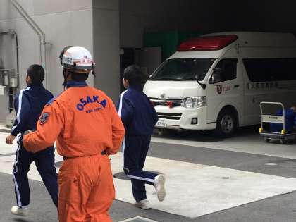 写真は、消防署での活動と、商店街での様子です。お客さまは先生です。
