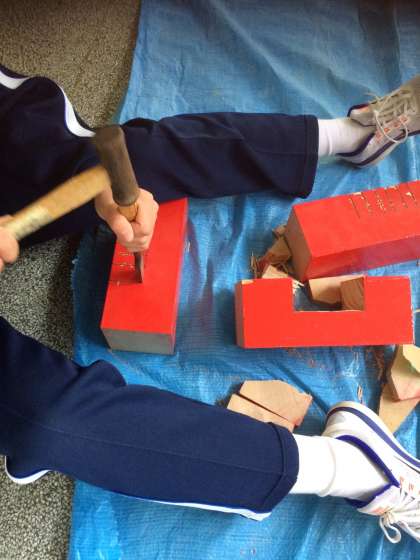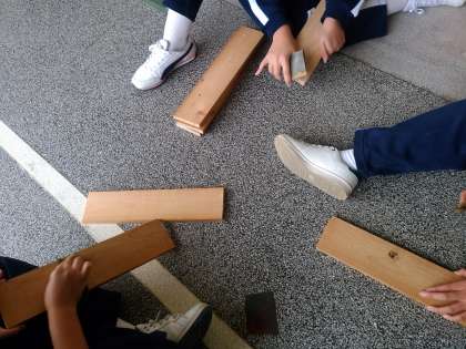 今日は3年生が懇談なので、その時間に当たっていない生徒に協力してもらって、廃材を使ってベンチを作っています。