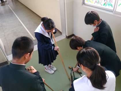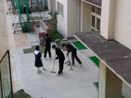 この時間はあちらこちらで清掃をしています。教室の中は勿論のこと、廊下や階段、グラウンドへの出入り口などは、土が沢山上がっているので大変です。