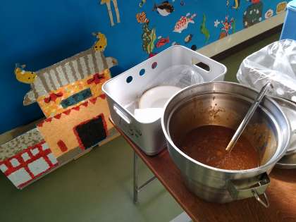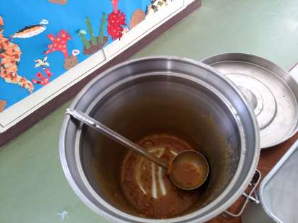 本日の給食は「カレー」です。大きな食缶に入っていたカレーもあっという間に空っぽです。