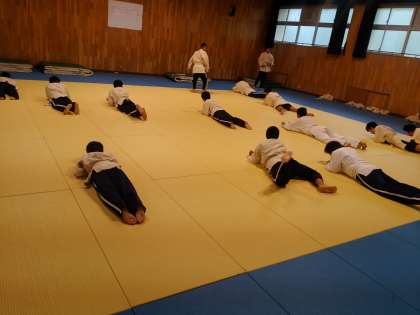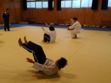 体育の授業風景です。柔道が始まりました。写真は基本動作を確認しています。3年生ですので、受け身をしっかり確認して、組手までできればと考えています。