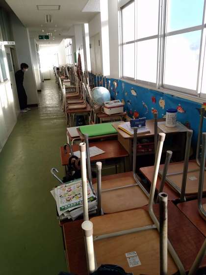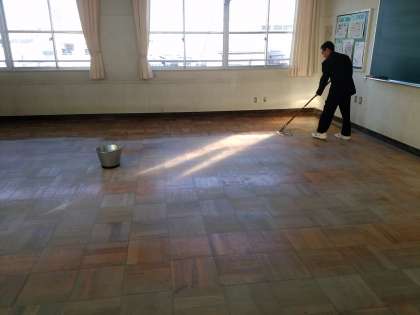 本日は、教室の机をすべて廊下に出して、床にワックスや油をひきました。