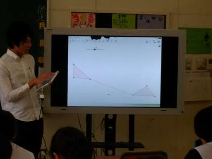 今日はICTを活用した数学の授業です。写真なので分かりにくいですが、三角形が、ある点を中心に移動する様子がよく分かります。