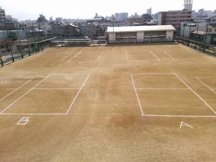 グラウンドにひかれたドッヂボールのコート。昼休みは消さないように遊びます。